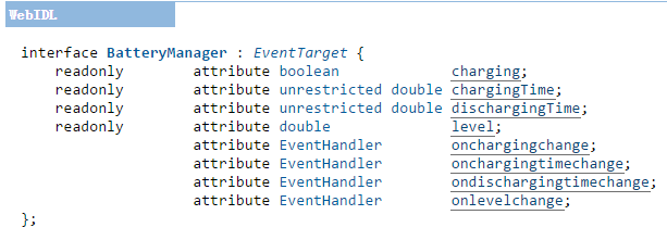 通过对getBattery()的调用,我们得到一个promise,这个promise会回调then方法,并提供一个BatteryManager对象,下面是对这个BatteryManager对象的说明: